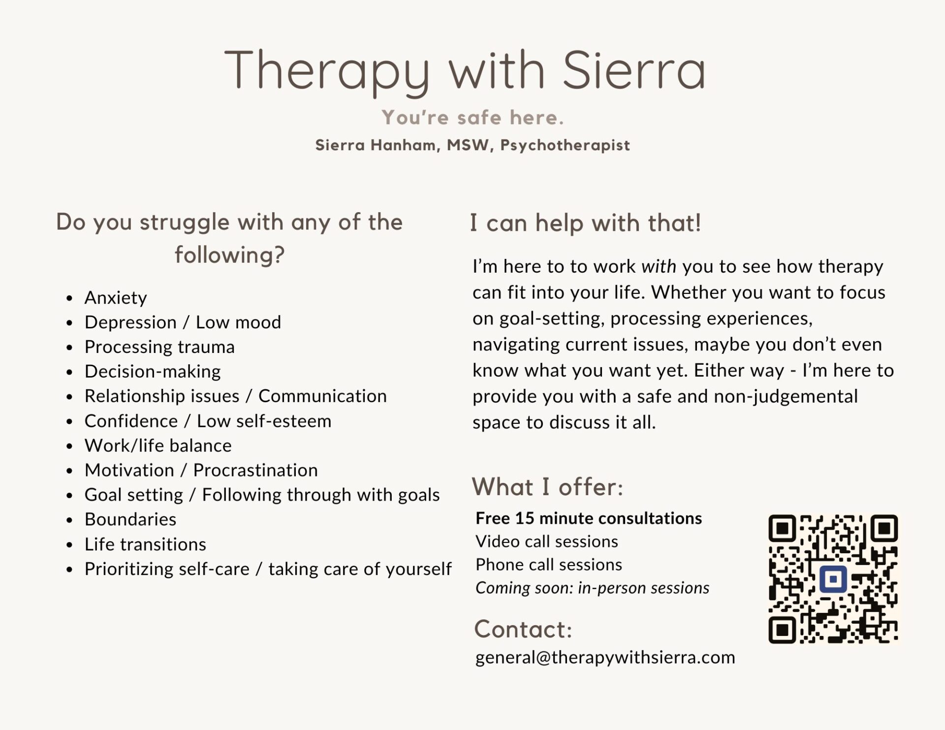 I'm here to help you find out how therapy can fit into your life. Check out my flyer and reach out if you have any questions! I offer free 15-minute consultations, and I'm happy to chat through email.